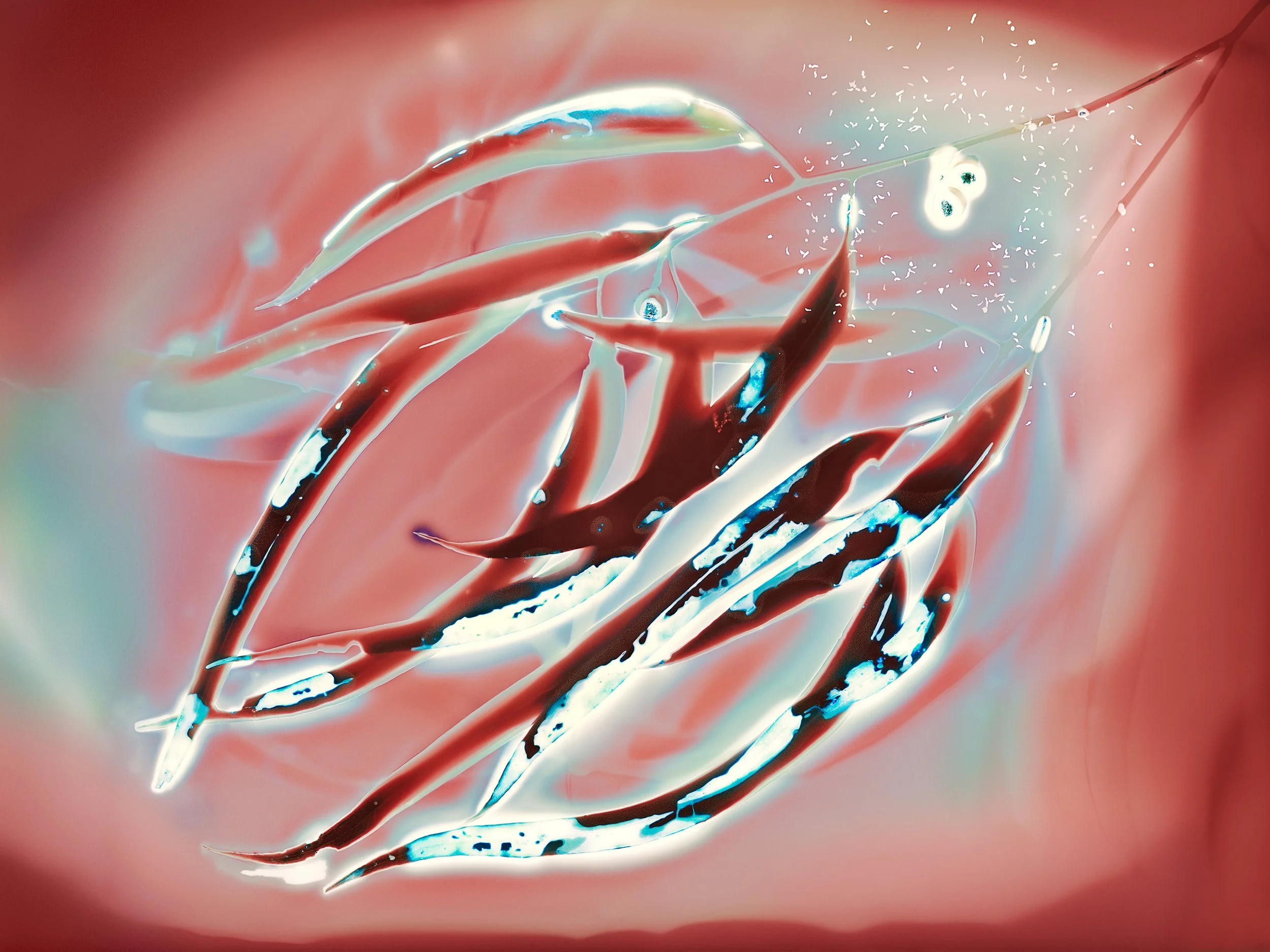 Each image develops uniquely over a week-long exposure to UV light, shaped by the plant’s inherent moisture and mineral composition, as well as the ambient temperature. After exposure, the images are digitally coloured, extending the process into a second phase of transformation that emphasises colour and tone to create otherworldly outcomes. The resulting works are unpredictable and abstract, revealing subtle gradients and imprints that record the meeting of organic, digital, and photographic matter.